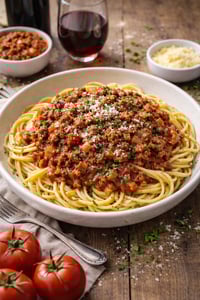 A rich and hearty Italian classic with slow-cooked beef ragù and fresh tomatoes.