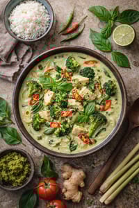 Fragrant and creamy Thai curry with tender chicken, vegetables, and aromatic herbs.
